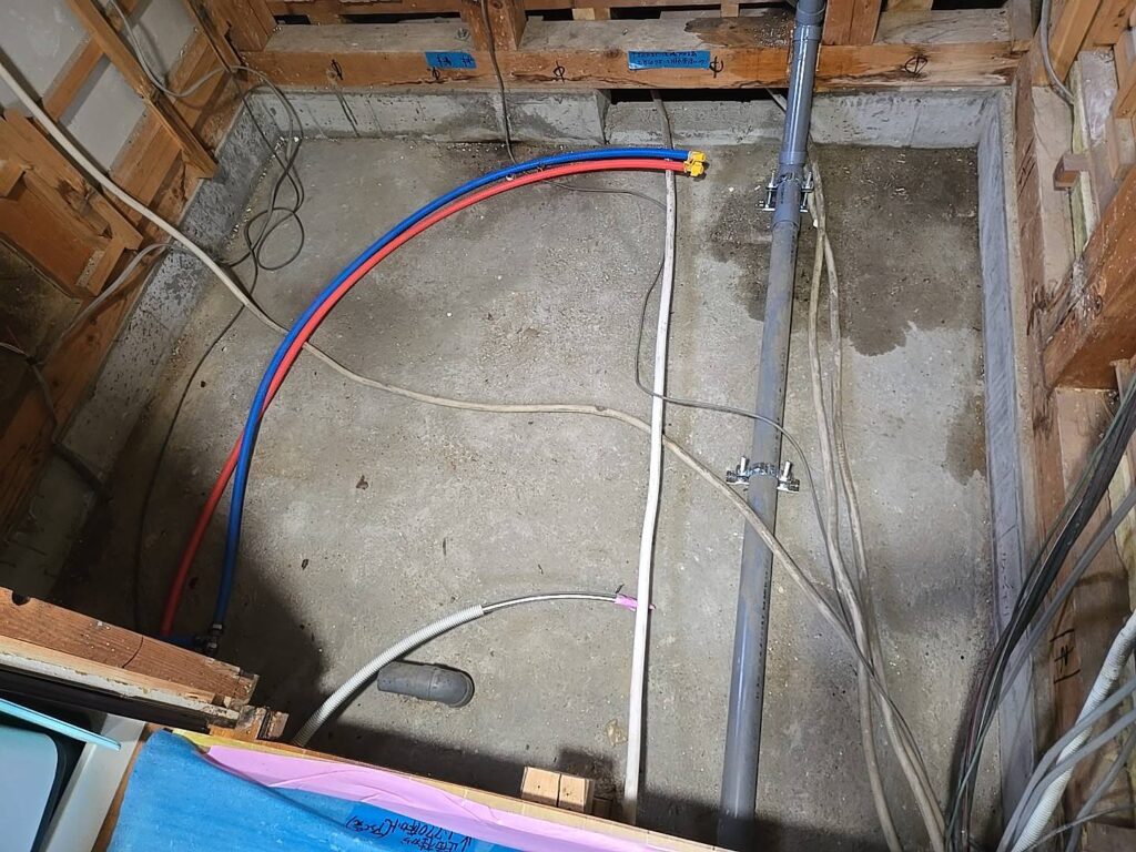 床下の配管写真からもわかるように、青い給水配管と赤い給湯配管を新しく配管し直し、将来的なトラブルを未然に防ぐ施工を行いました。